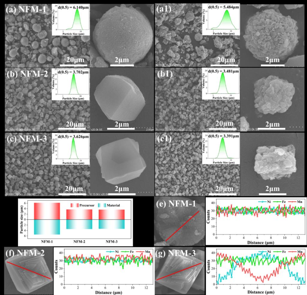 为实现高性能与高稳定性的兼顾,研究团队摒弃了传统均质材料的设计思路,采用共沉淀法,创新性地构建了一种具有“镍富集核心-锰富集外壳”的梯度结构O3型正极材料NaNi1/3Fe1/3Mn1/3O2。该独特的结构如同为材料核心穿上了一件“锰基防护服”,内核保证了高反应活性,而外壳则有效抑制了过渡金属溶解、缓解了表面副反应,并维持了稳定的钠离子传输通道,从而实现了反应活性与结构稳定性的完美平衡。研究团队指出,该梯度结构设计不仅为钠离子电池正极材料的开发开辟了新路径,也为其他可充电电池体系的结构优化提供了普适性策略。