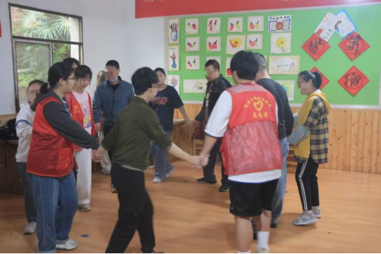 清晨,伴着微微细雨,志愿者们到达湘潭市亲园培智学校后志愿者们与负责老师对接沟通,了解一些注意事项和活动流程。活动一开始,许多亲园的同学们积极加入到志愿者玩耍的队伍中,大家其乐融融,一起玩了各种充满童趣的游戏,例如:一二三木头人、抱抱团等等。活动期间,志愿者给他们分发了零食和糖果。紧接着,志愿者开始播放电影,每个人端坐在椅子上,注视着墙上投影出来的电影,仿佛身临其境。此外,志愿者们还一起帮助亲园老师们准备玩具手工材料,与“孩子们”在手工室一起做手工。各种各样有趣的小游戏,让所有人的脸上都露出开心的笑颜。