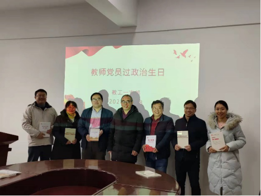 学院党委书记张何和教工第一、二支部书记刘万民、张儒为过“政治生日”的党员同志送上了书籍礼物。